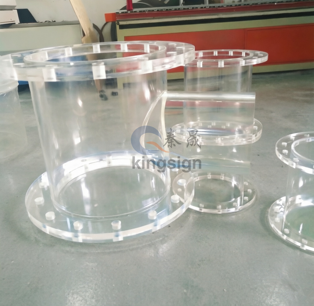 हे फ्लँग केलेले ऍक्रेलिक पाईप्स मोठ्या प्रमाणावर पायलट प्लांट सिस्टम, शैक्षणिक संशोधन सेटअप, पर्यावरण निरीक्षण उपकरणे आणि कमी-दाब द्रव वितरण प्रणालींमध्ये वापरले जातात जेथे पारदर्शकता आणि विश्वासार्हता आवश्यक आहे. तुम्हाला मानक आकाराची किंवा पूर्णपणे सानुकूल सोल्यूशनची आवश्यकता असली तरीही, किंग्साइन तुमच्या ऑपरेशन्समध्ये सातत्यपूर्ण कामगिरीसाठी कडक सहिष्णुतेसाठी तयार केलेले ॲक्रेलिक फ्लँज घटक वितरित करते.